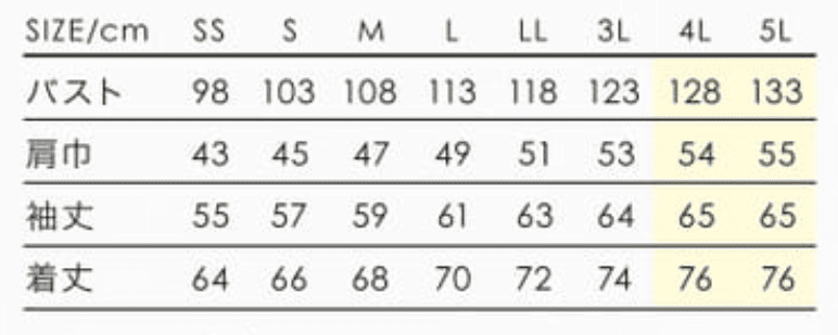 | サイズ | SS,S,M,L,LL,3L,4L,5L |