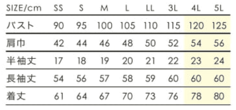 | サイズ | SS,S,M,L,LL,3L,4L,5L |