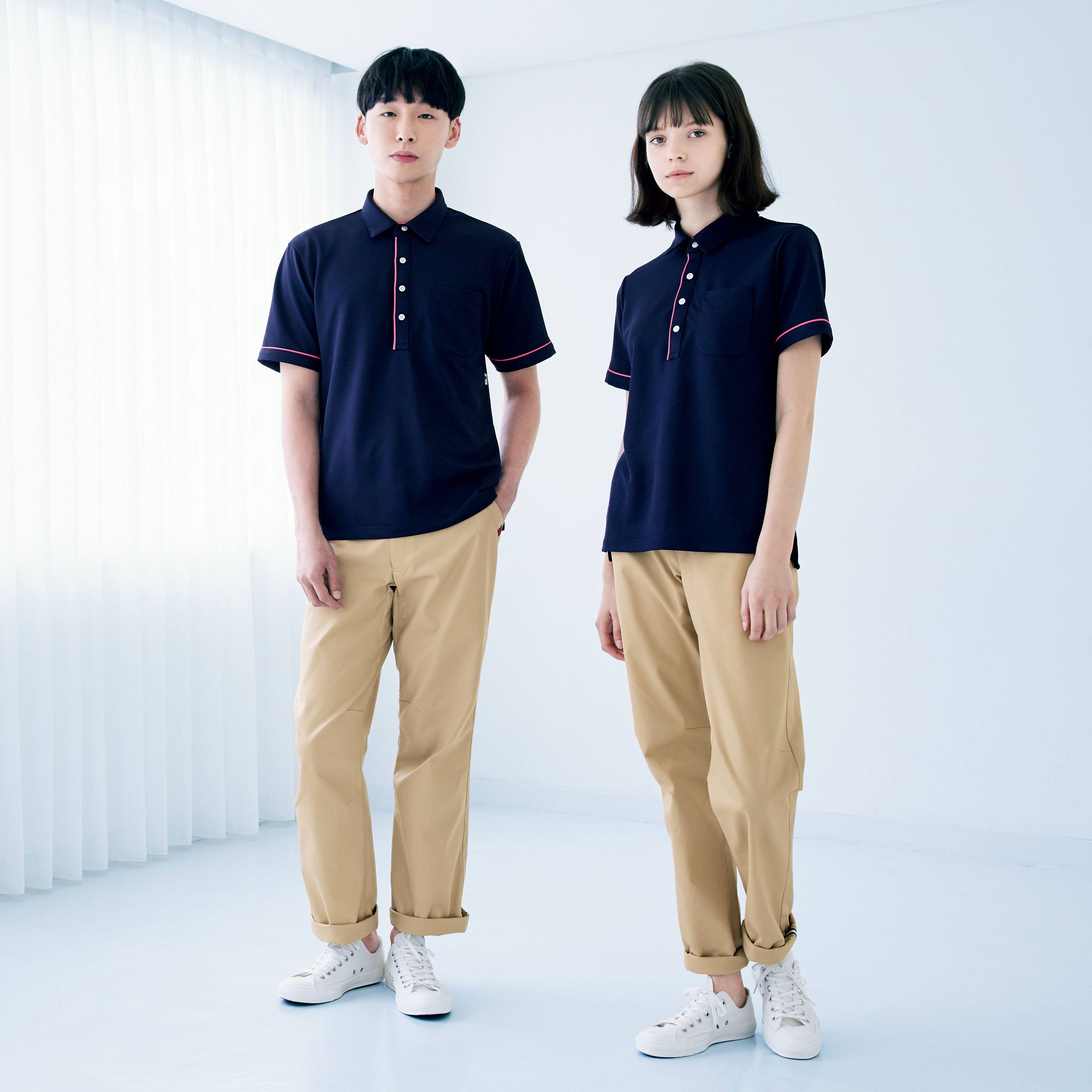 通気性の高いポリエステル100%の鹿の子ニットを使用しているため、汗をかいても肌にまとわりつきにくく、サラリとした爽やかさが特徴です