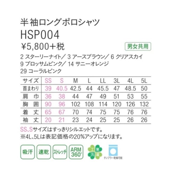 HSP004-9 男女兼用半袖ロングポロシャツ ブロッサムピンク