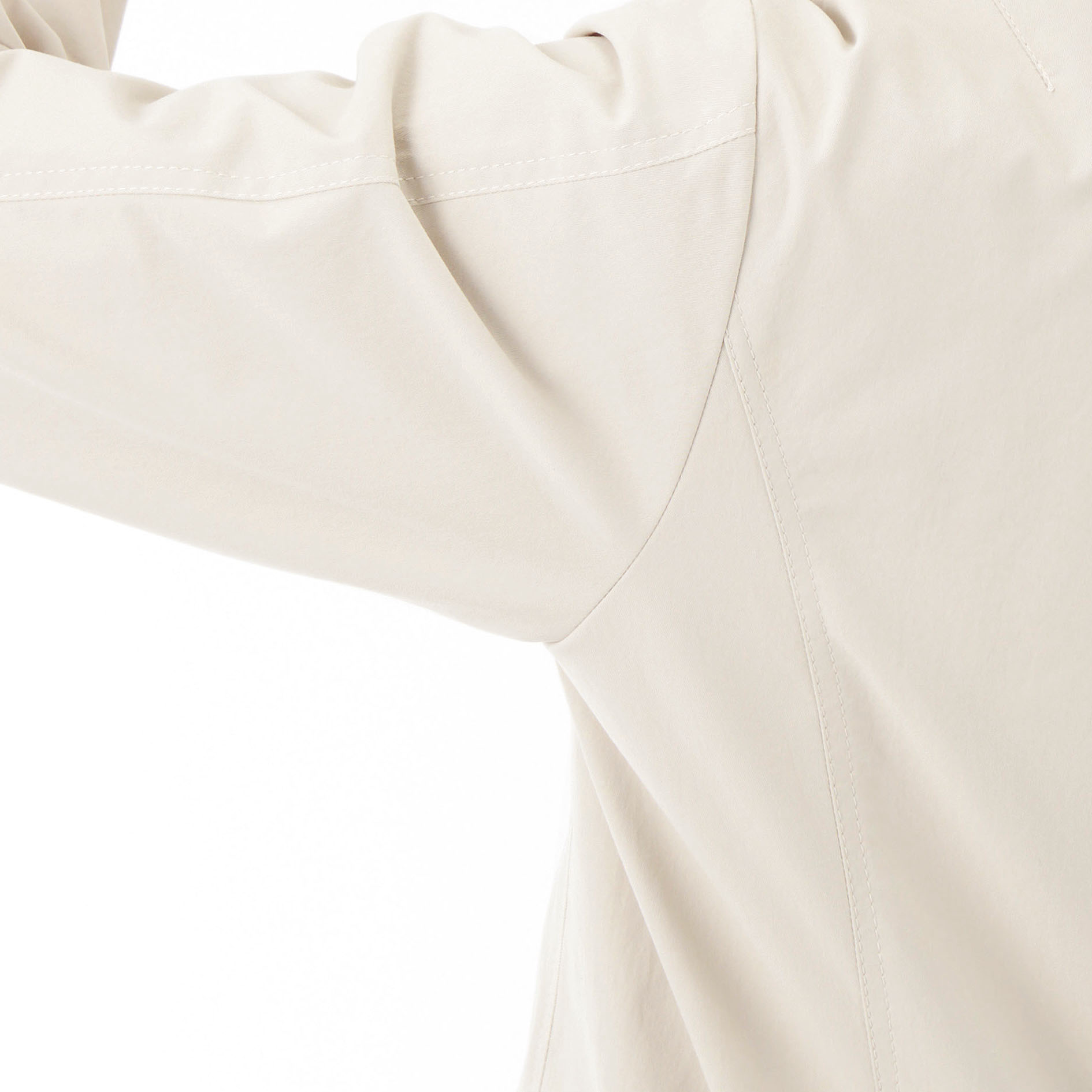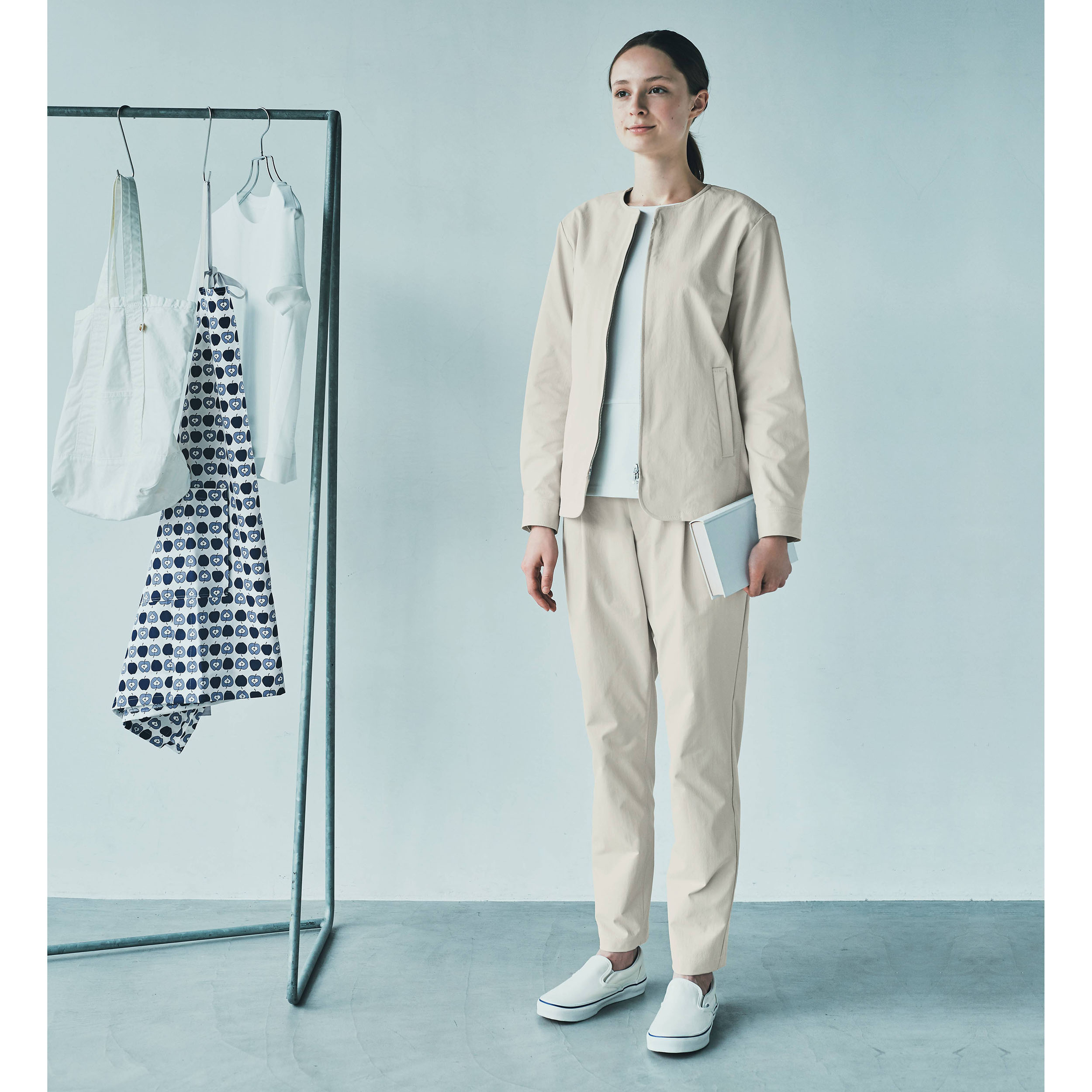 リラックス感のある綿タッチでシワ加工のカジュアルブルゾンを、ミニマルなノーカラーデザインでスタイリッシュに。