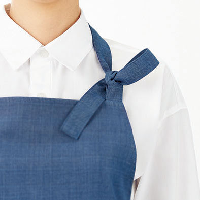 腰ひもを前で結ぶユニセックスなエプロンはダンガリー調素材。