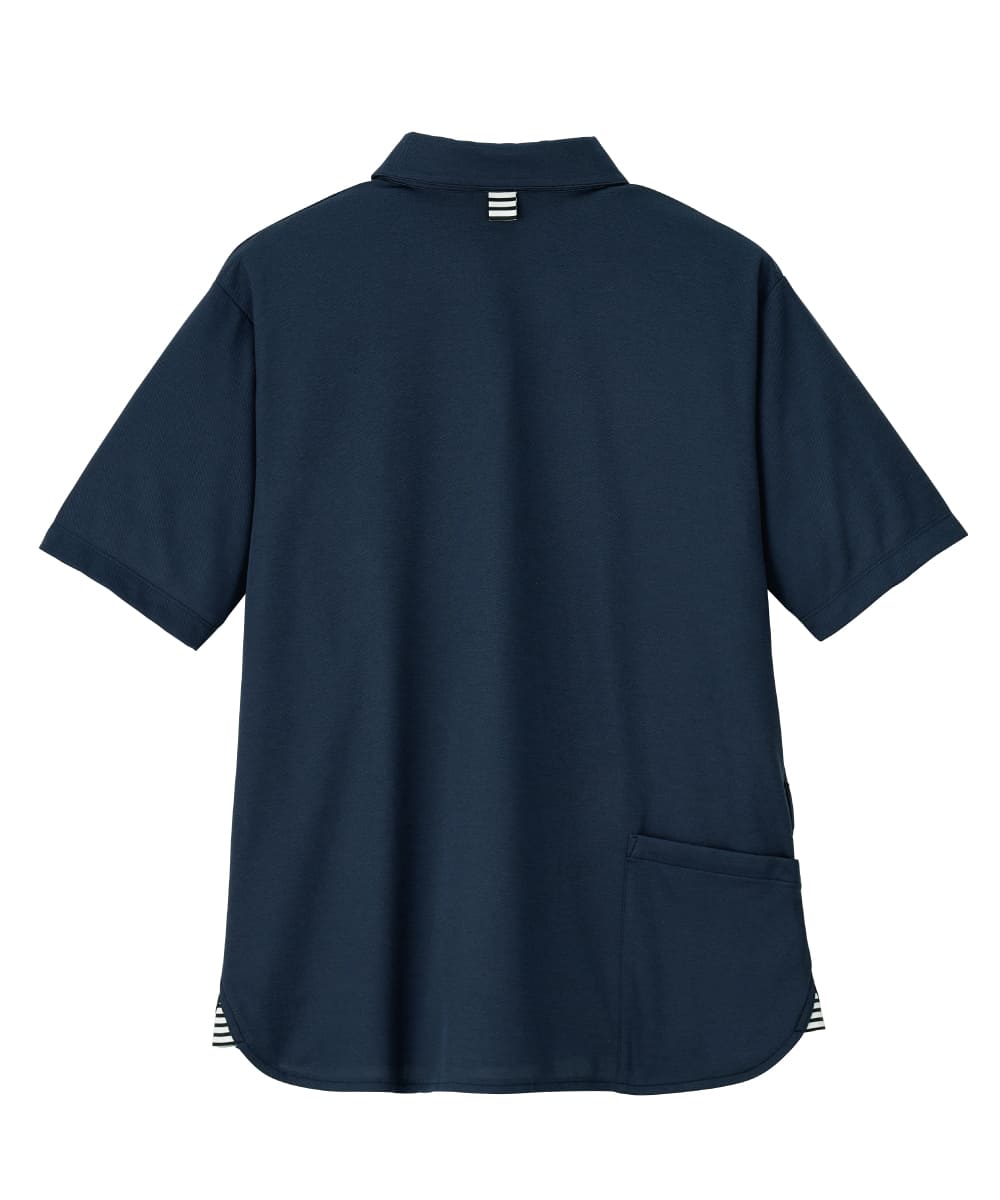 立体感のある台襟つきの首元と、シャツ風のやわらかなヘムラインが程よいきちんと感を演出