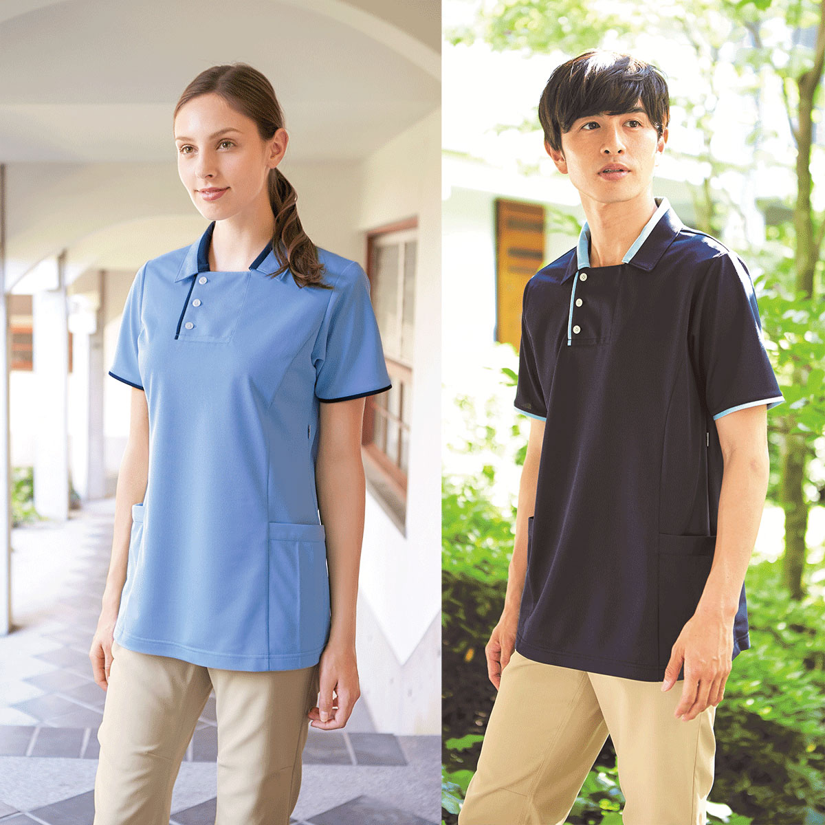 介助のジャマにならないように配慮されたロング丈で、衿もとに医療ユニフォームの雰囲気を取り入れた、安心感のあるデザインです。